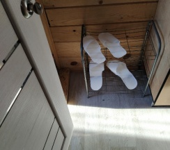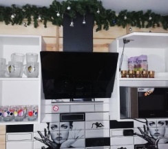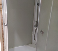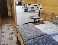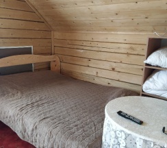 Гостеприемная хозяйка, милая женщина радушно нас встретила, проводила в номер. Номер представляет собой комнату + санузел на втором этаже домика. Просторная комната (большая кровать, 2 односпальные кровати, шкаф, тумбочки, телевизор, кухонная зона со всем необходимым). В санузле унитаз, душевая кабина, раковина, всё мыльно-рыльное имеется. Нам не понравилось маленькая территория и большое скопление людей на ней.