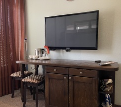 В номере большое зеркало, шкаф, утюг, гладильная доска, холодильник.