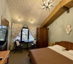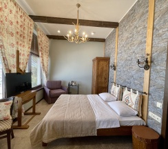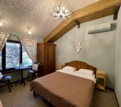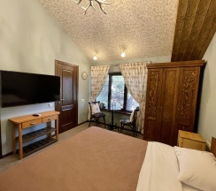 Уютный номер с одной двуспальной кроватью со своим сан. узлом. В номере расположены: кровать, шкаф для одежды, кресло-кровать, плоский телевизор, обеденный уголок, сплит-система. Панорамные окна с прямым видом на Геленджикскую бухту. Дизайн номера выполнен в стиле Western/Country.Style/