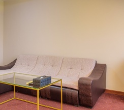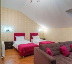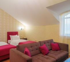 Просторный номер Супериор с двумя односпальными кроватями и диваном. Интерьер номера выполнен в теплых тонах. В номере могут разместиться трое гостей, в качестве дополнительного места застилается диван.