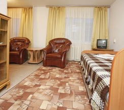 В номере: Шкаф для одежды, Холодильник, Телевизор, Телефон для связи с администрацией, Обеденная зона, Туалетная комната с установленной в ней ванной или современной душевой кабиной.