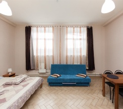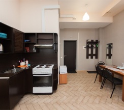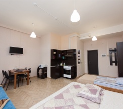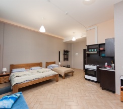 Номер 36 м.кв .Кухня в номере. Одна большая кровать (1800*2000), диван-книжка,микроволновая печь, мини -кухня,телевизор, туалет и душевая в номере.