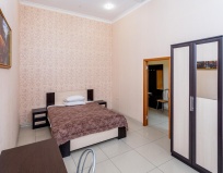 Рядом с ЖД вокзалом. Если приехали на поезде , через 200 метров вы на месте. Рядом магазинчики, готовая кухня- кулинария. В пешей доступности центральная пешеходная улица -пр.Мира, Набережная Терека. Само здание - бывший Дом Железнодорожника. Номер полулюкс - ощущение что сделан из бывшего кабинета, огромный холл - бесполезный. Мебель уставшая. Розетка только с одной стороны кровати. В главную розетку воткнуто - телевизор, тв приставка, холодильник, чайник. Все это друг на друге, постоянно отходит и холодильник отключается. Висел один халат, какой то плюшевый, цвет- ощущение что застиранный белый-серый. Лучше уж вообще без него. Но есть кулер с холодной и горячей водой на этаже. Зубная щетка с пастой, шампунь. Очень приятный персонал.