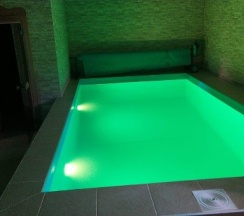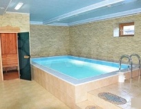 В доме есть сауна в цокольном этаже. Парилка небольшая, на три человека. Бассейн примерно три на пять метров. Душевая, туалет, зона отдыха, все это присутствует.