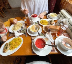 Так как в комнатах не предусмотрено употребление пищи, для нас был предоставлен ресторан с камином и богатым меню, с о-очень большими порциями, вкусно приготовленными.