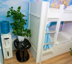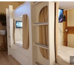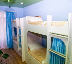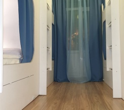 Уютная светлая комната на 8 человек. Имеет два типа спальных мест: Нижний ярус - капсульное место со шторкой, Верхний ярус - обычное спальное место.