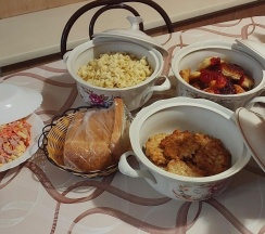 Во время ужина мы были в сауне и нам принесли покушать в комнату отдыха. Очень удивились и порадовались тому, что еду принесли не на тарелках, а в специальной посуде (чтобы не остывала).