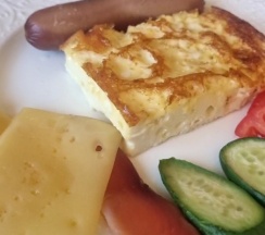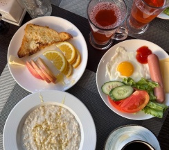 Завтрак это отдельная история. Где он проходит - надо поискать. При заселении об этом ни слова. Только карточка с пропуском на завтрак и стоимостью в 700 р. После того как его найдешь, а он в Сорт баре, где тебе все утро транслируют тайский бокс. Ты сел за стол и тебе сразу несут чай или кофе (по желанию) и пока ты ешь эта история остывает и пьешь ты по итогу - холодный кофе. На любителя конечно, но мне не зашло. Наполнение завтрака - очень достойное на твердую 4. Манная каша, амлет с жареной сосиской, овощи, красная рыба, сыр.