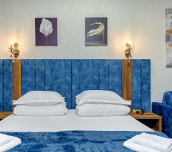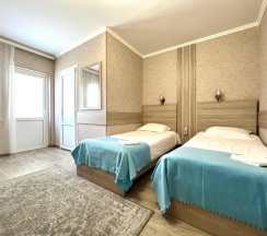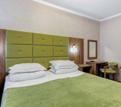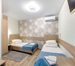 Уютный номер для друзей или коллег площадью 15м². Номер с видом на бассейн. В номере светлый интерьер, две односпальные кровати шириной 90см, кондиционер, телевизор, холодильник, шкаф, зеркало. Санузел в номере. Номера находятся на 1, 2 или 3 этажах во 2 корпусе.