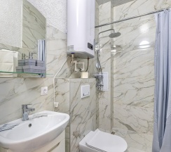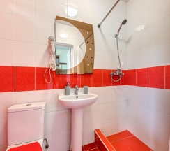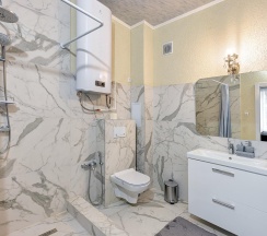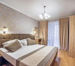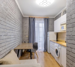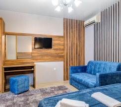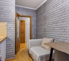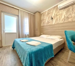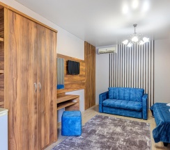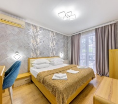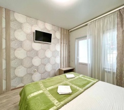 Просторный современный апартамент площадью 50м², уютная атмосфера, стильный дизайн. Идеальны для семьи или компании. Своя кухня, посуда, чайник, микроволновка, холодильник, обеденный стол. Двуспальная кровать шириной 180см и диван-кровать 160см, кондиционер, шкаф, туалетный столик. Санузел в номере. Апартамент с видом во двор находится на 1 этаже нового 3 корпуса.