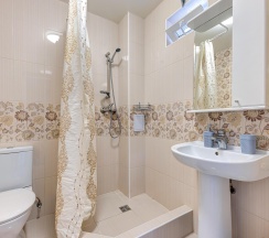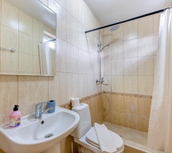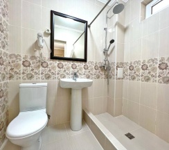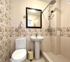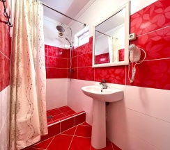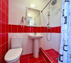 Удобный трёхместный номер с видом на бассейн площадью 18м². Подходит для семьи с ребёнком или компании из трёх гостей. Двуспальная кровать шириной 180см и кресло-кровать 90см, холодильник, кондиционер, уютная атмосфера. Санузел в номере. Номера находятся на 2 или 3 этажах во 2 корпусе.