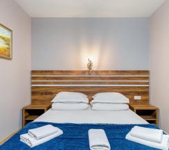 Апартамент на мансардном этаже площадью 43м² прекрасный вариант для семейного отдыха или компании близких друзей. Своя кухня, посуда, чайник, микроволновка, холодильник, обеденный стол. Двуспальная кровать шириной 180см и диван-кровать 130см, кондиционер, шкаф, туалетный столик. Санузел в номере. Апартамент с видом во двор находится на 3 этаже нового 3 корпуса.