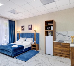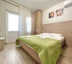 Трёхместный апартамент площадью 25м² — отличное решение для семейного отдыха или компании, предпочитающей готовить самостоятельно. Полностью оборудованная кухня, посуда, чайник, микроволновка, холодильник, посуда, обеденный стол. Двуспальная кровать шириной 180см и диван-кровать 100см, кондиционер, шкаф, туалетный столик. Стильный интерьер и современная мебель. Санузел в номере. Данный апартамент с видом во двор находится на 1 этаже нового 3 корпуса.