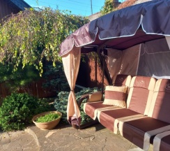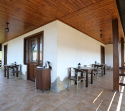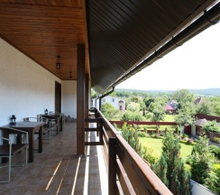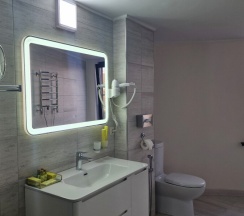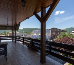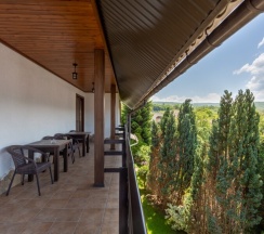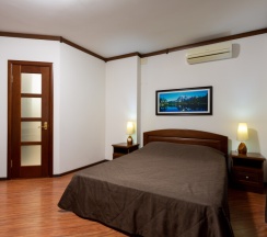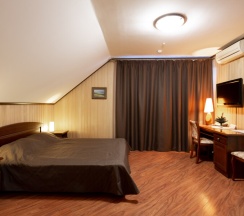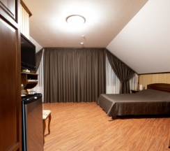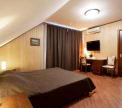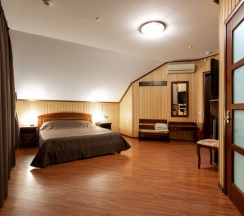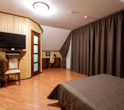 Просторный семейный номер на втором этаже с отделным входом и панорамным видом на сад с ландшафтным дизайном. Номер с шумоизоляцией. Оснащен двуспальной кроватью, диваном-кроватью, телевизором, холодильником, электрочайником, сплит-системой, Wi-Fi. Для хранения особо ценных вещей номера оборудованы сейфами. В ванных комнатах — сантехника и душевые кабины европейского качества, фен, косметические средства для личной гигиены, махровые халаты и тапочки, отдельные халаты и полотенца для всесезонного подогреваемого бассейна. Связаться с обслуживающим персоналом или со своими друзьями, отдыхающими в соседних номерах, можно по внутренней связи. Из номеров есть выход в сад с уличной мебелью. Великолепный завтрак включен в стоимость размещения
