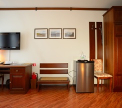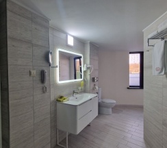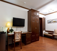Просторный семейный номер с отделным входом и панорамным видом на сад с ландшафтным дизайном. Номер с шумоизоляцией. Оснащен двуспальной кроватью, диваном-кроватью, телевизором, холодильником, электрочайником, сплит-системой, Wi-Fi. Для хранения особо ценных вещей номера оборудованы сейфами. В ванных комнатах — сантехника и душевые кабины европейского качества, фен, косметические средства для личной гигиены, махровые халаты и тапочки. Связаться с обслуживающим персоналом или со своими друзьями, отдыхающими в соседних номерах, можно по внутренней связи. Из номеров есть выход в сад. Великолепный завтрак включен в стоимость размещения