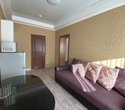 Семейный номер, размещение от одного до четырёх гостей . Площадь 30 кв.м. В номере: для более комфортного сна,установлены автоматические роль ставни на окнах, большая двухспальная кровать (200/200), прикроватные тумбы,светильники,диван-кровать (160/200),кухонный гарнитур,сплит-система, жк телевизор, микроволновая печь,холодильник,чайник,письменный стол,обеденный стол,4 стула,шифоньер,набор полотенец, шампунь, гель(саше),тапочки в индивидуальной упаковке.Большая собственная ванная комната оснащена тёплым полом,феном,жидким мылом для рук,одноразовыми зубными щеткам.