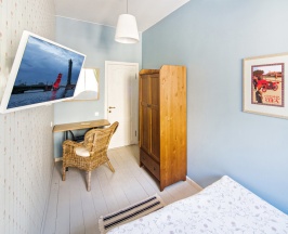 Из минусов: нет смены белья без доплаты, не всегда свет на лестнице включался сразу, приходилось как крот пробираться в темноте. В комнатах для вещей есть в кроватей ящик, но с очень неудобной крышкой. Крышка эта все равно не закрывается на замок, так что возможно рациональнее было бы убрать верхнюю крышку. Так, людям не пришлось бы выдвигать в узком коридоре ящик на полную длину, тревожа при этом сопутствующими шумами соседей.