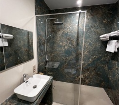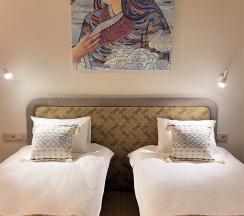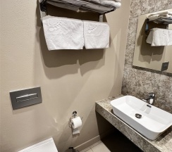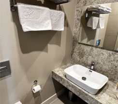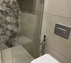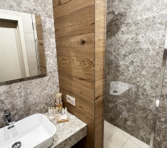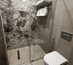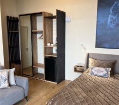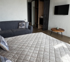 Большая уютная двуспальная кровать с ортопедическим матрасом, гипоаллергенными подушками и одеялом. Для Вашего комфорта в номере сделаны теплые полы с керамогранитом. Отдельный выход на террасу, где можно насладиться утренним кофе и природой.