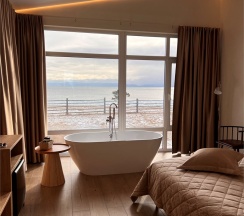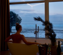 Номер расположен в отдельно стоящем доме. Панорамные окна с живописным видом на озеро Байкал, у окна расположена ванна. Наши гости любят наблюдать потрясающие закаты нежась в теплой ванной с ароматной пеной. Всё необходимое для этого уже заботливо приготовлено для Вас.