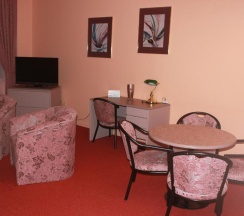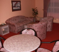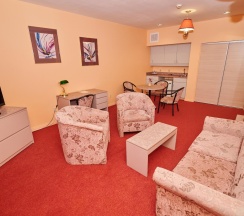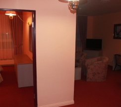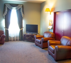 Двухкомнатный номер (спальня, холл), площадью 60 кв.метров, с двуспальной кроватью. Имеется два санузла, один из них расположен в спальной комнате. В номере имеется автономное горячее водоснабжение круглый год, тапочки, халат, фен, ЖК-телевизор – IP телевидение с дистанционным управлением, холодильник, сейф, телефон с выходом на междугороднюю и международную связь, мини-кухня, посуда, косметический набор, набор для чистки обуви, набор для чистки одежды, комплект полотенец. Смена белья производится раз в три дня. В номере к услугам клиента питьевая бутилированная вода.