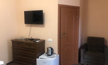 В номере двуспальная кровать, мини-холодильник, телевизор, фен, кондиционер. Санузел с тëплым полом, полотенцесушителем, одноразовым мылом и шампунями, есть даже складная сушилка и тазик. Вдобавок ко всему этому в номере нашли полотенца и кружки.