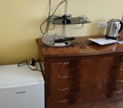 В номере двуспальная кровать, мини-холодильник, телевизор, фен, кондиционер. Санузел с тëплым полом, полотенцесушителем, одноразовым мылом и шампунями, есть даже складная сушилка и тазик. Вдобавок ко всему этому в номере нашли полотенца и кружки.