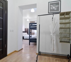 Семейный номер с двуспальной кроватью и одной двухъярусной кроватью. В номере есть всё необходимое для комфортного проживания.