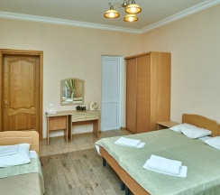 Комфортный двухместный номер с общей террасой,кровати разделяются,есть доп.место кресло-кровать,в номере имеется холодильник,кондиционер,электрочайник,набор посуды на двух персон,ТВ,душ/туалет в номере,шкаф,две тумбы прикроватные,туалетный столик с зеркалом.