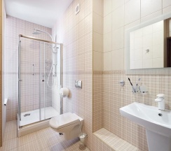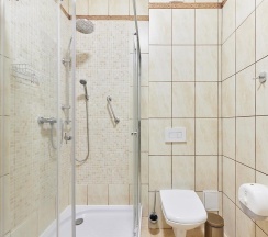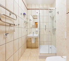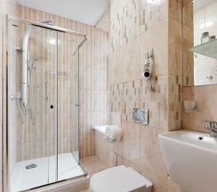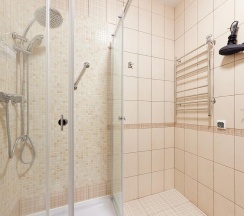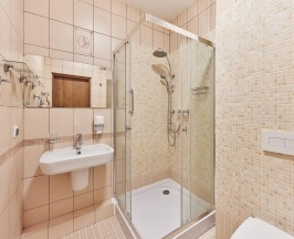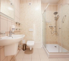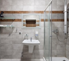 душевая кабина, фен, туалетно-косметические принадлежности.