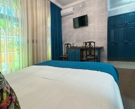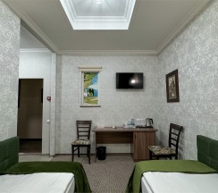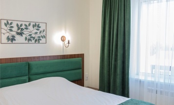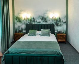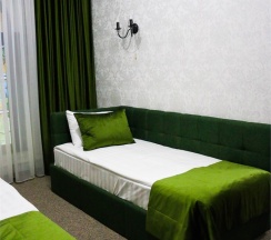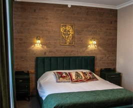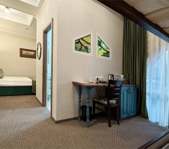 Эксклюзивный номер категории полулюкс с большой кроватью с мягким изголовьем 160*200, номер выполнен в зеленых оттенках природного цвета. Площадь номера 26 кв.м. Номер располагается на 2 этаже нового корпуса бутик отеля. Собственная ванная комната укомплектована туалетно-косметическими принадлежностями, тапочки, халаты. . Чайная станция с чаем и кофе, бутилированная вода. В номере мини-холодильник, телевизор с плоским экраном, кондиционер. В стоимость номера включен континентальный завтрак по меню, охраняемая парковка под видеонаблюдением.
