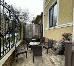 Есть маленький, но уютный дворик с садовой мебелью, где можно посидеть. Вечером просто прекрасно. Улочка тихая, движение одностороннее, машин не много.