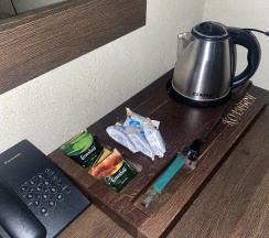 В комнате кондиционер, холодильник, чайник. Чай/кофе. На этаже куллер (что очень приятно, в сезон жара, а тут прохладная вода), также гладильная доска и утюг.