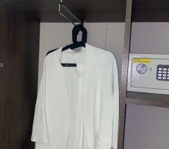 На втором этаже сразу же приглянулась уютная комната. Хороший ремонт, чистота, белоснежное белье, неплохие подушки и одеяла. В ванной все необходимое, душевая кабинка очень чистая, горячая вода без проблем, все принадлежности, туалетная бумага с запасом. Только фен неудобный. В комнате есть еще диван, комод, письменный стол, сейф, чайник с чашками, чай/кофе 3в1, графин для воды и стаканы. Напольная вешалка, отдельно вешалка для костюма. Халаты, конечно, одного размера, мне на 48 был впритык, муж даже не пытался)) Тапочки стандартные. Кондиционер, телевизор.