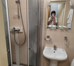 Вода в душе не уходит,да и душ сам такой себе,но за такую цену сойдёт.Кровати комфортные,есть телевизор,кондей и холодильник.Окна времён СССР как и сама гостиница,самый раритет тут лифт,но в общем,жить можно и комфортно,если ты не эстет и если не так важно качество душевой.