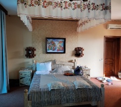 Отдыхали втроём с ребенком с 13 по 22 июня в этом замечательном отеле. Бронировали сильно заранее вместе с билетами на поезд) Отличное местоположение, тихое место, несмотря на проспект, всё в шаговой доступности. До набережной 5-7 минут, магазин в соседнем здании, кафе- столовые в 10 минутах очень приличные. Сам отель очень понравился. Сказочная обстановка в русском народном стиле, всё чистое, всё работало. Номер стандарт улучшенный 23м², два балкона, во двор и на улицу, столик со стульями на том что во двор. Сушилка, оснащение номера отличное, полотенца, халаты, тапочки, отдельно выдают полотенца для похода на пляж, не нужно везти с собой громоздкие свёртки. Парковка нам была не актуальна, но и она здесь есть. Бассейн чистый, ребенок плескался) отдельно стоит рассказать про завтраки, которые включены в стоимость. Завтрак континентальный, по меню, но дополнительно сырная/колбасная нарезки, яйца вареные, булочки, паштеты и джемы, кушайте сколько хотите. Чай кофе в доступе всегда. Сами завтраки обалденные, вкуснейшие, свежайшие! Детский уголок также есть. Большое спасибо персоналу за радушный прием и вкусное питание. Обязательно порекомендую друзьям и по возможности вернёмся сами!