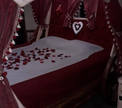 Прекрасный номер с кроватью-каретой. Номер ещё больше в действительности, чем на фото. 2 мини балкончика. Огромное панарамное окно на бассейн.