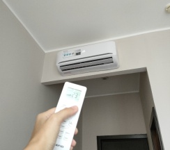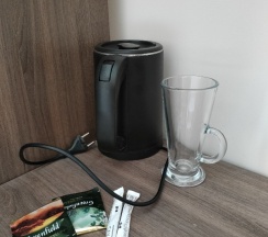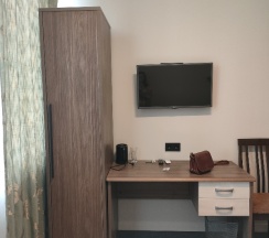 В номере есть всё необходимое: чайник, фен, кондиционер, достаточно вместительный шкаф.