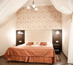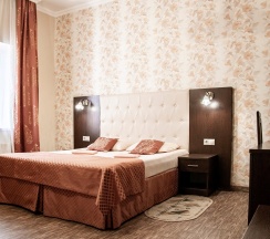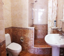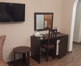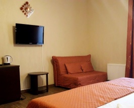 Номера чистые, постельное поглажено, в номере полотенца, туал.бумага, 2 небольших мыла, 2 геля для душа, есть фен, кровать с удобным матрасом, столик с зеркалом и стулом, 2 тумбочки, шкаф, у двери типо тумбы , и столик у телевизора, телевизор с парочкой кабельных каналов, точное кол-во не помню, в номере также графин, 2 кружки, 2 бокала, чайник, мини холодильник, есть в подвале кухня с посудой, чайником, плитой, микроволновкой, кухней не пользовались.