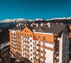 Отель находится в горной зоне, откуда открываются потрясающие виды на окружающие вершины. Есть трансфер до подъемника и канатной дороги. Ещё в здании отеля есть кафе, там вкусные завтраки, обеды и ужины, а также богатый выбор напитков и десертов.