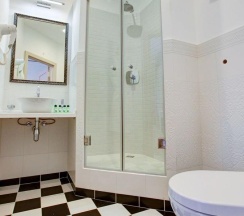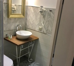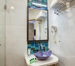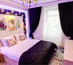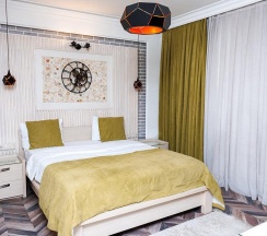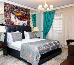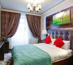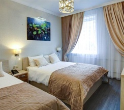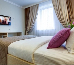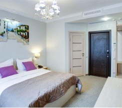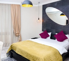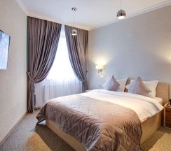 Номера категории "Комфорт" с одной большой двуспальной кроватью, площадью 26 кв. метров восхищают авторским дизайном, все номера разные по интерьеру как в самом номере так и в ванной комнате. Гостей ждет красивый и не навязчивый интерьер, картины ручной работы, уникальный дизайн итальянской сантехники, классические хрустальные люстра, современная техника, рабочий стол, бесплатный Интернет. Ванная комната декорированная зеркалами, английской плиткой, оснащена отдельной душевой кабиной. В распоряжении гостей мягкие халаты, тапочки, а так же фирменные косметические принадлежности