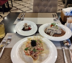 Хороший и уютный отель. Есть свой ресторан,где утром завтрак шведский стол,обед и ужин по записи и выбор меню у администратора или в самом ресторане.