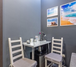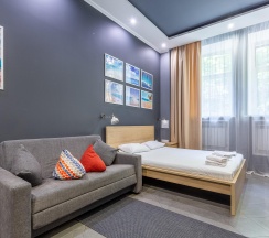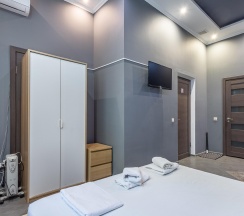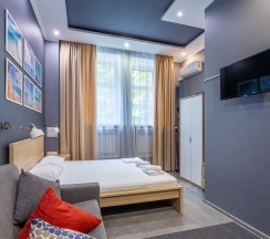 Дизайнерский евро ремонт. Вся мебель новая, чистое постельное белье, полотенце. В номере чайник, фен, вешалки, журнальный столик, зеркало, комод, обеденный стол, письменный стол, тумбы, шкаф для одежды. В номере двуспальная кровать и диван-кровать.