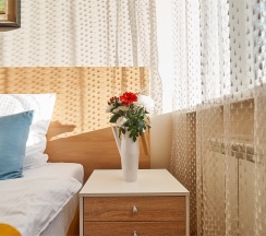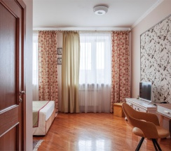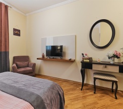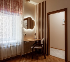 Люкс (Lux) – двухкомнатные номера, общей площадью 45 кв. м. Интерьер номеров выполнен в классическом стиле. Номера данной категории позволят с комфортом разместиться от двух до четырех гостей. Размещение возможно, как на двух односпальных, так и на одной односпальной кроватях. Уютная спальня, просторная гостиная, ванная комната, оборудованная современной сантехникой, – все это в Вашем полном распоряжении. В номере для Вас подготовлены книги, чтобы Вы могли провести тихий, уютный вечер за чтением и чашечкой чая. Чайник, чайная пара и конфеты тоже приготовлены для Вас в номере. В мини-баре Вы всегда сможете найти прохладительные напитки и легкие закуски.