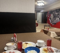 На завтрак, шведский стол, есть все чтоб перекусить и начать новый день. Не хитро, но на любой вкус: выпечка, каши, йогурты, омлет. Все сложно перечислить.