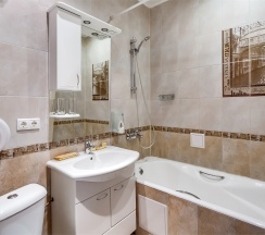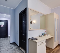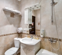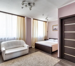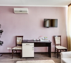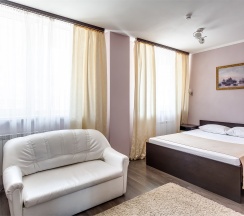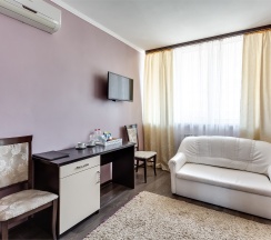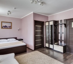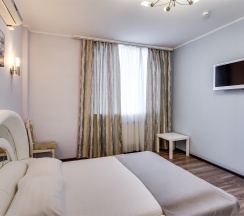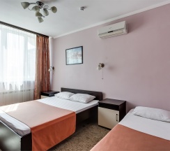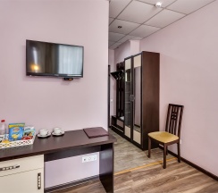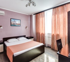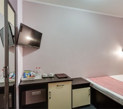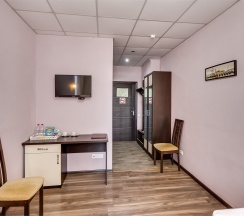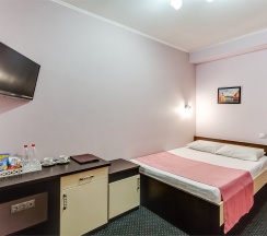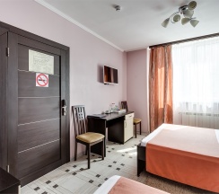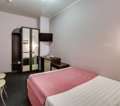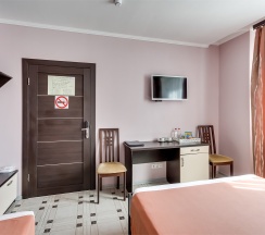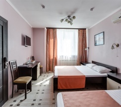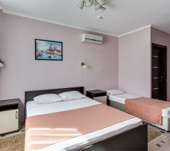 Семейный это трехместный номер с одной большой двуспальной кроватью и односпальной кроватью или раскладным диваном-кроватью. Такой номер — отличное решение для веселого путешествия в семейной компании. Его можно также заказать для нескольких сотрудников, направленных в командировку, несмотря на то, что он многоместный, в нем очень достойное оформление интерьера и обслуживание гостей. Хорошая сплит система, большой письменный стол, шкаф для одежды, холодильник, ЖК Телевизор, одноразовые тапочки для всех постояльцев, полотенца, банные принадлежности, и, конечно же, фен. За скромную доплату к стоимости номера (всего 500 р. в сутки) в нем можно разместить еще одну односпальную кровать.