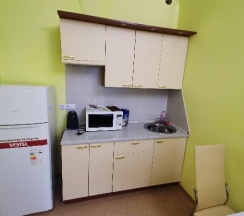 1. Большая приличная комната со всеми удобствами: кухонное место, холодильник, микроволновка, чайник, прикрепленный стол, раковина с моющим средством, посуда.