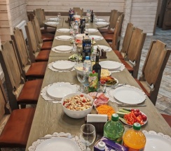 Отличные,,симпатичные новые дома, вместительная, горячий банный чан и отличная русская баня с вениками и банными шапочками. Были в большом доме, любим бильярд, очень обрадовались, что есть новый стол для пула со свежим сукном! Удобно на большую компанию до 8-10 человек. Очень вкусная кухня и широкий ассортимент блюд. Рекомендую!