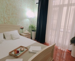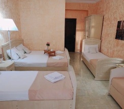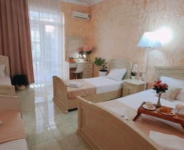 Номер оборудован: двуспальная и односпальная кровать, телевизор, прикроватная тумбочка, шкаф, туалетный столик, телевизор, кондиционер, мини-холодильник, wi—fi, французский балкон.