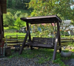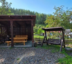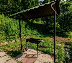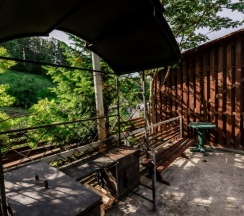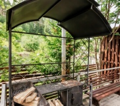 Видовой двухуровневый номер с панорамными окнами и выходом на просторную террасу. Прекрасный обзор на окрестные горы с лесом, сад, тихую улицу. Собственная мангальная зона, уголок для отдыха с качелями.