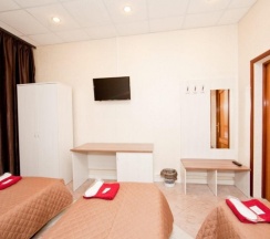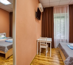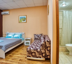 Просторный, уютный номер, рассчитан на три человека. Для вашего удобства предоставлен плазменный ТВ, холодильник, чайник и высокоскоростной Wi-Fi. Ванная комната общая. Лучший вариант для размещения семьей или небольшой компанией.